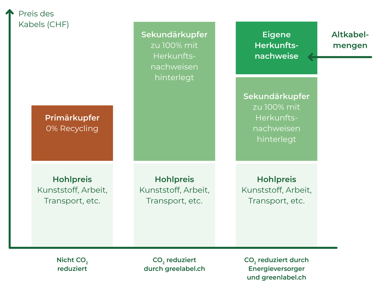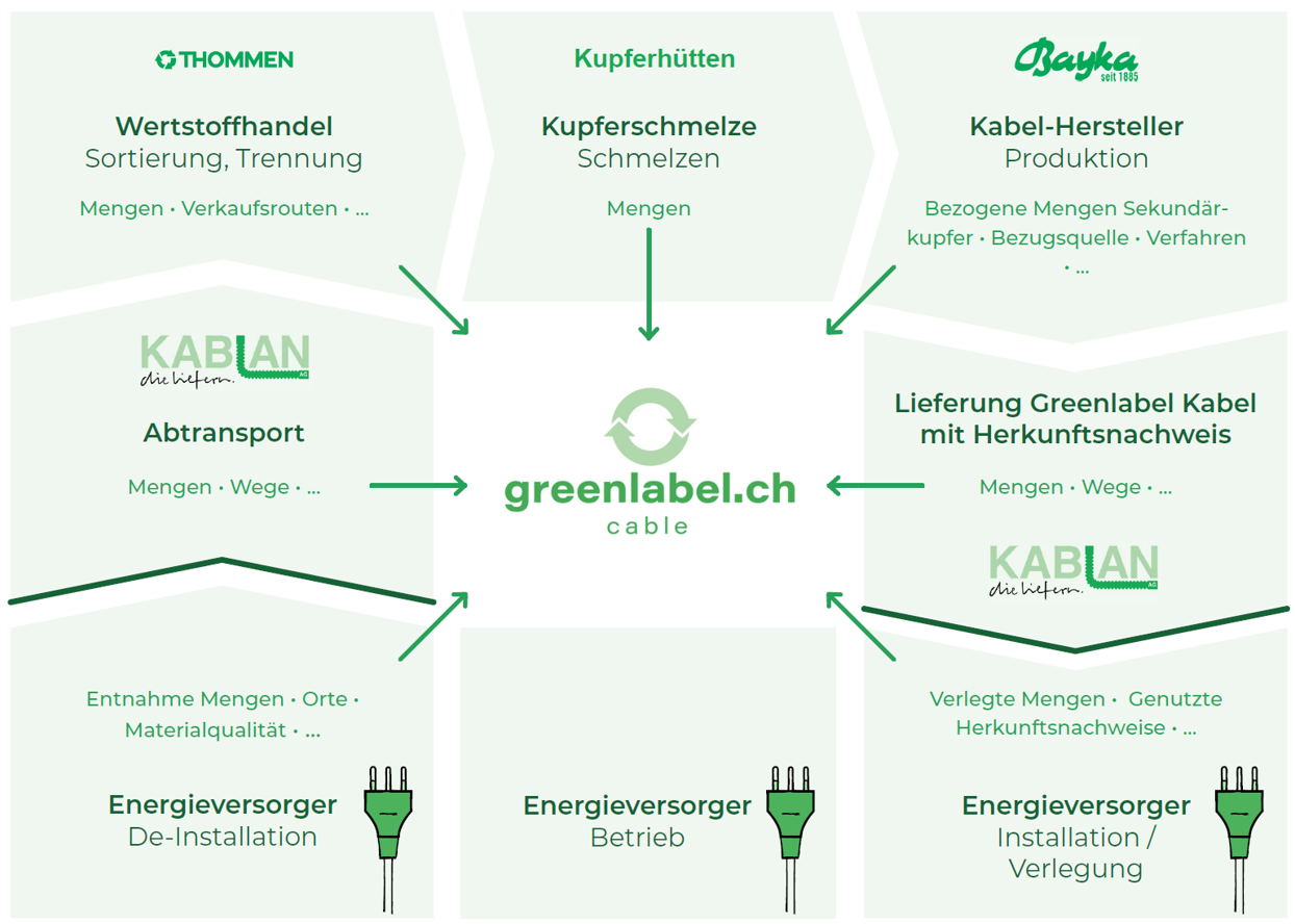Greenlabel verfolgt das Ziel, den Anteil von Sekundärkupfer in neuen Kabeln zu erhöhen. Damit ermöglicht Greenlabel einen reduzierten CO₂-Fussabdruck bei Kupferkabeln und schafft einen echten Mehrwert, der die höheren Kosten für die Verwendung von Recyclingkupfer rechtfertigt.